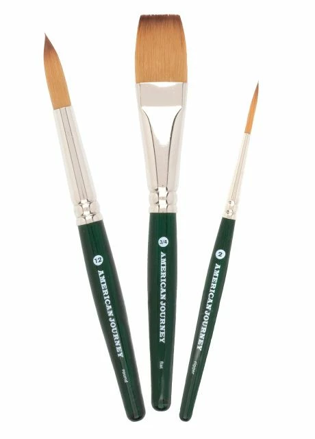 An interlocking process enables these American Journey Synthetic Brushes to hold their shape while allowing precise stroke control. They retain their sharp edge or point even when wet. Each art brush features Golden Toray nylon and each synthetic fiber is hand-molded to reflect the curve of natural hair, then set deep into a seamless nickel ferrule attached to a gorgeous deep green colored wooden handle.