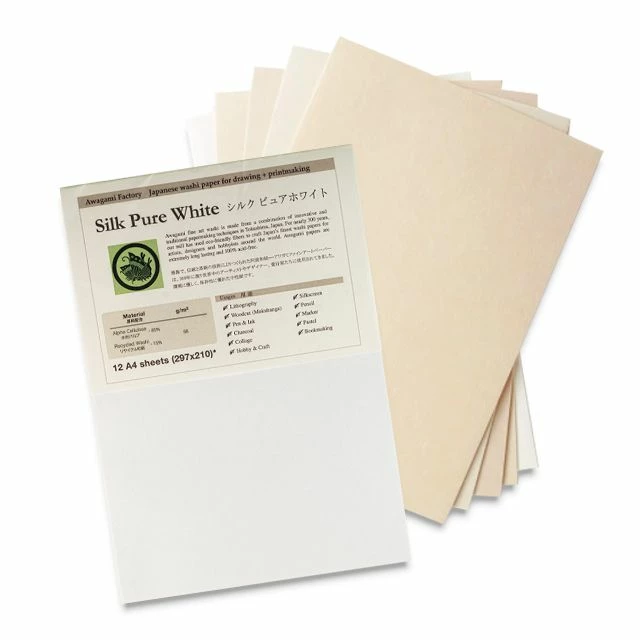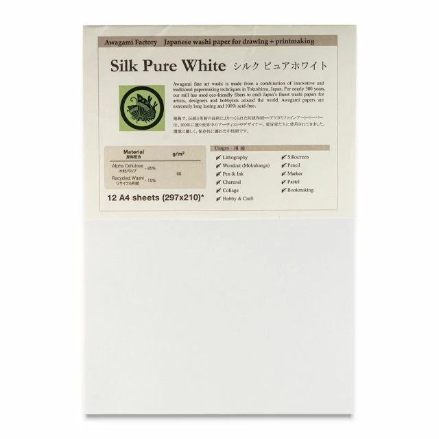 Silk Pure White, 12 Sheets – This A4-sized paper pack includes 12 sheets of warm white, medium-weight Japanese paper with two distinct surface textures.