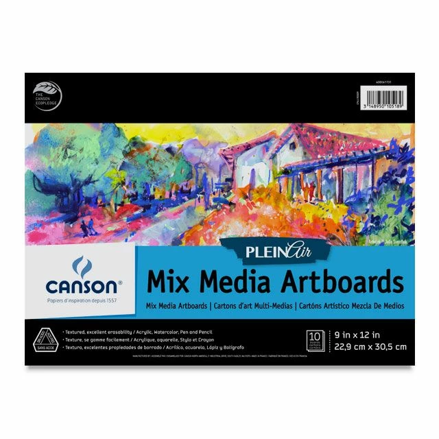 From the Plein Air line, Canson Plein Air Mixed Media Artboards are ready to see the world or just the inside of your studio. Ten rigid, textured artboards are held in place with glue along the spine and have a convenient heavyweight fold-over cover. Usable with acrylic, watercolor, pen, and pencil. The same quality and reliability you’ve come to associate with Canson drawing paper, now in a to-go pad! Acid-free.