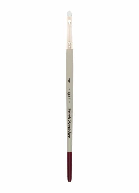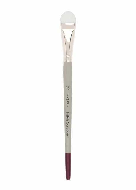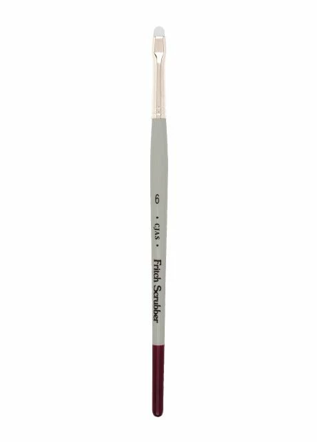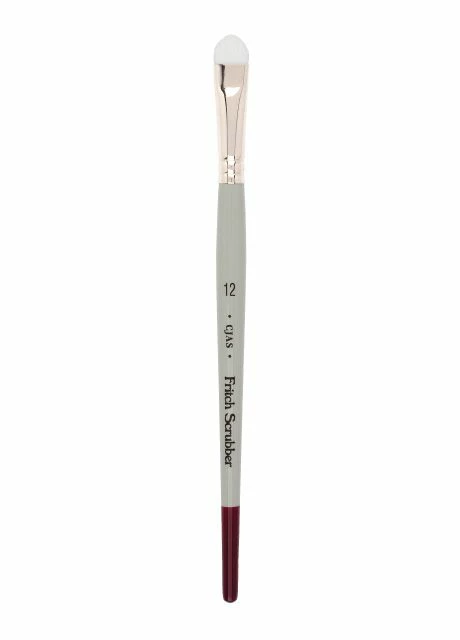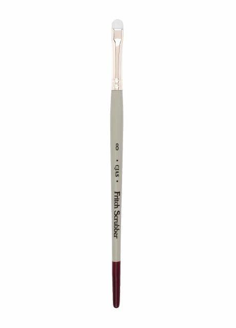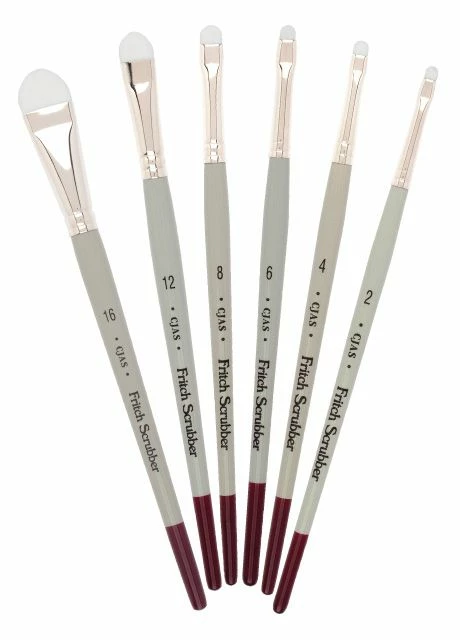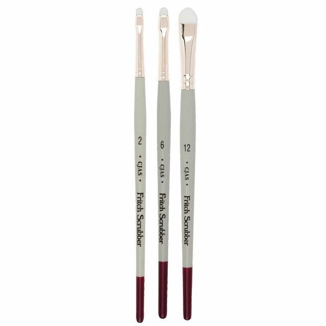 Each Cheap Joe’s Fritch Scrubber features short white nylon, a nickel ferrule and a traditional watercolor handle.