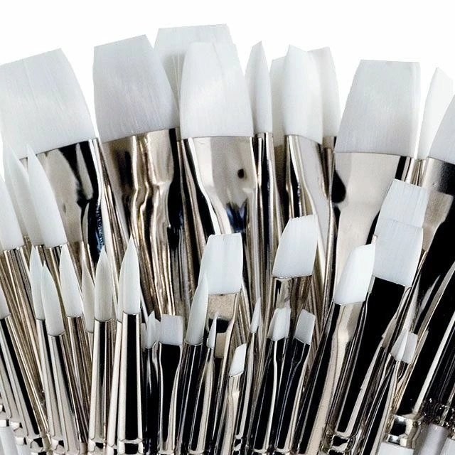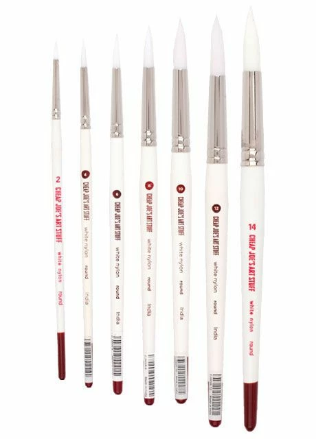 Each Cheap Joe’s White Synthetic art brush features white nylon and a nickel ferrule attached to a crisp white colored wooden handle with a red tip.