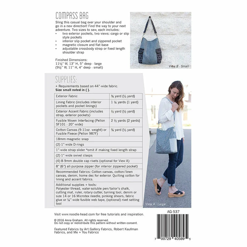 Sling this casual bag over your shoulder & go in a new direction! Find the way to your next adventure. Two sizes to sew, each includes:
