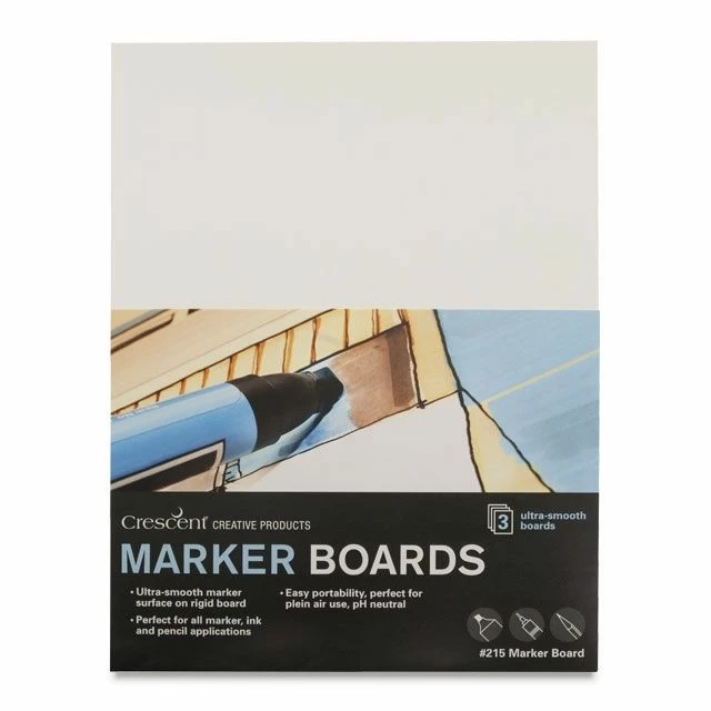 No. 215 Hot Press Marker Board – This medium weight, professional grade artboard features a buffered bright white surface for greater contrast with pen-and-ink and transparent washes. These hot-press boards are extra smooth to provide unparalleled sharpness for pen and marker. The smooth surface is also ideal for transfer lettering, adhesive film, acrylic washes, and oil pastel. Each board is a hefty 18-ply with a buffered cream core.