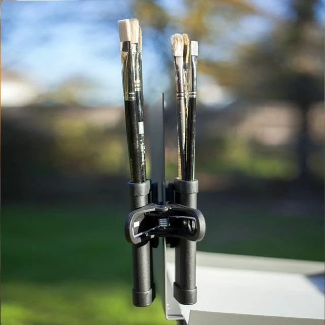 The Easel Brush Clip measures 6″ high and can be clipped onto anything up to 2-1/4″ thick. Each clip is made of durable black plastic that’s lightweight and easy to pack in your painting kit. You’ll find you want several clips for your studio easel, your outdoor easel, and your home or office.