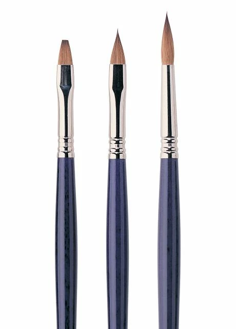 Each Escoda Optimo watercolor paint brush features the finest Kolinsky Sable and a triple-crimped nickel plated ferrule attached to a long, lacquered blue wood handle.