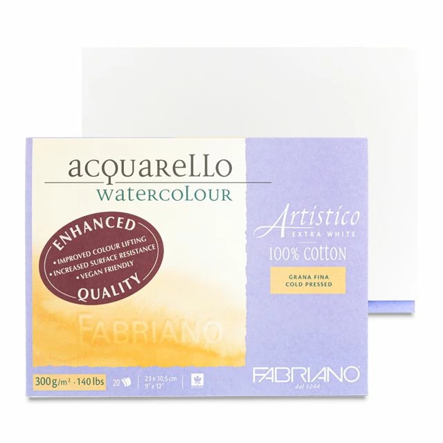 Fabriano Artistico Extra White Watercolor Paper delivers the purest bright white paper available without the use of optical brighteners or bleaches. It’s mould-made from 100% cotton, is chorine- and acid-free, and is internally and externally sized with a plant-based synthetic, vegan-friendly sizing. The enhanced quality sizing offers increased surface resistance to handle the toughest scrubbing and scraping, improved color lifting, and consistent texture and absorbency. Not just for watercolor, it’s suitable for all water media, charcoal and pastel, graphite, and other drawing media.