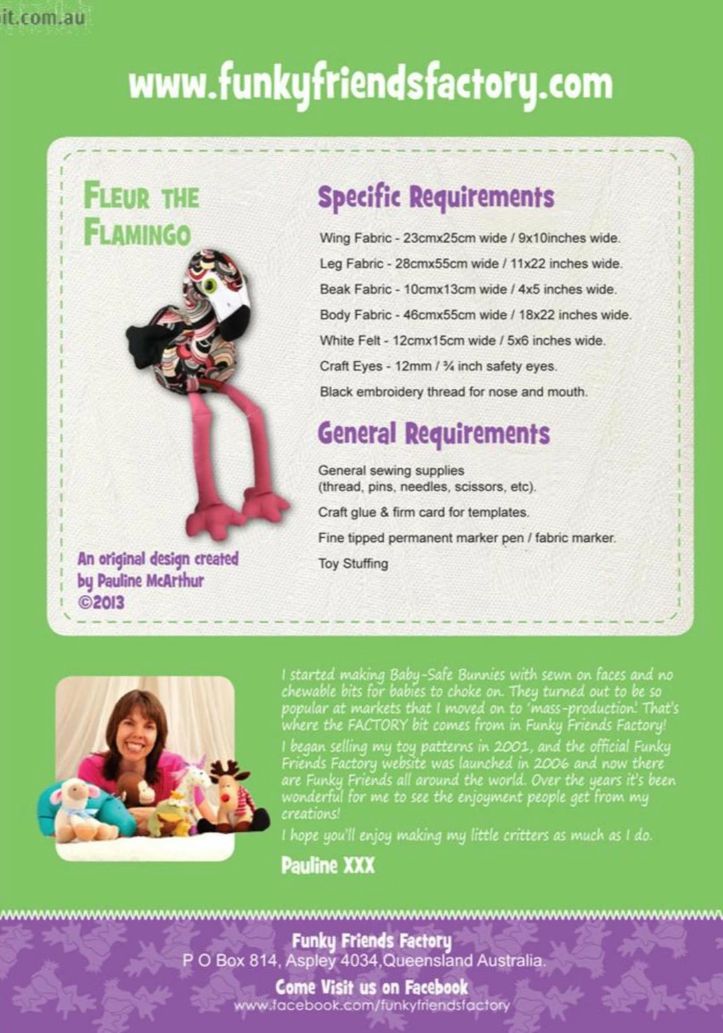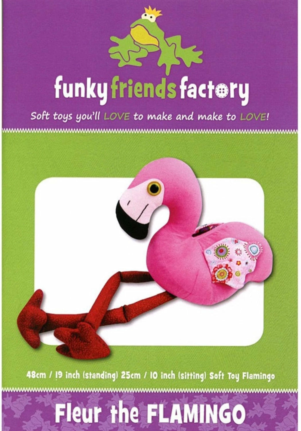 Fleur the Flamingo is the latest addition to the Funky Friends Factory. She’s only little so she is still a little bit clumsy as she practices balancing on one leg, but I think she’s starting to get the hang of it! She is a quick and simple pattern to sew and you’ll have fun using up your fabric scraps for her wings. Make her in bright cheerful pinks or experiment with other colours of the rainbow too!