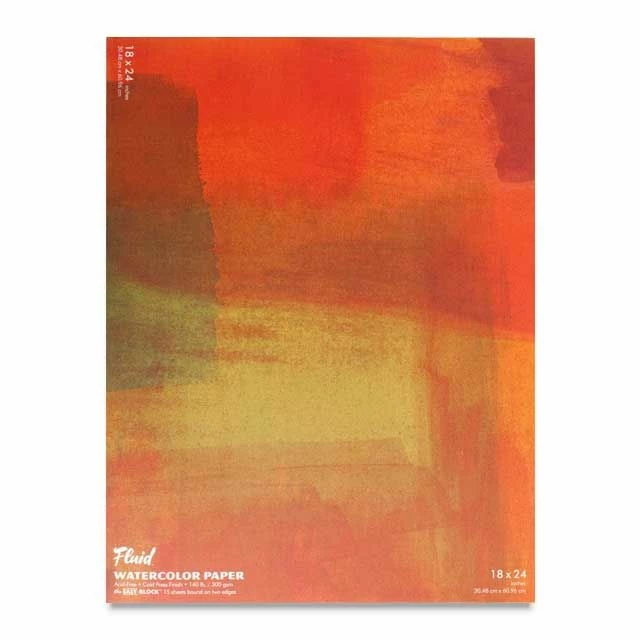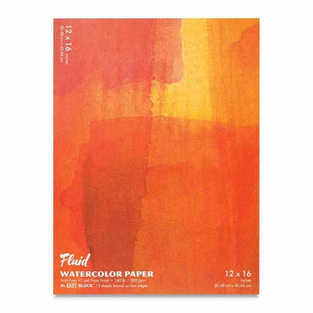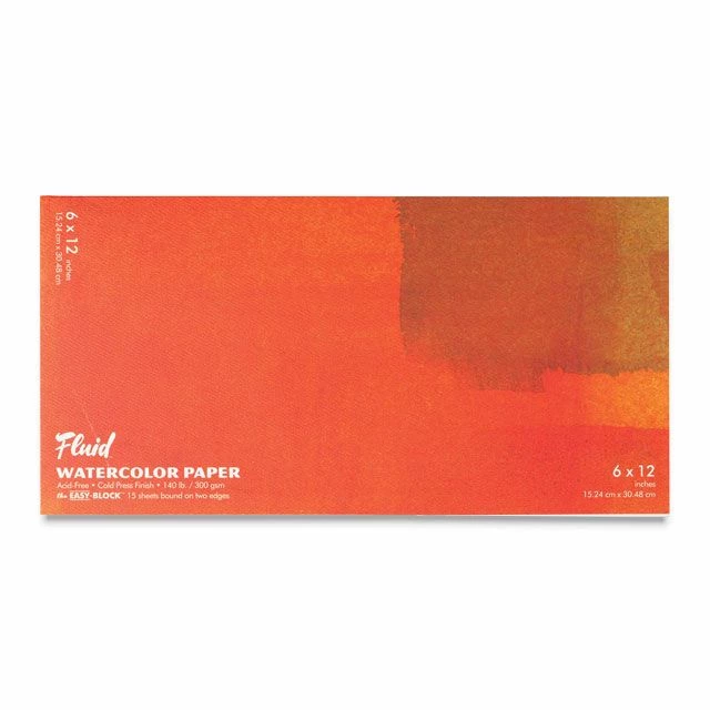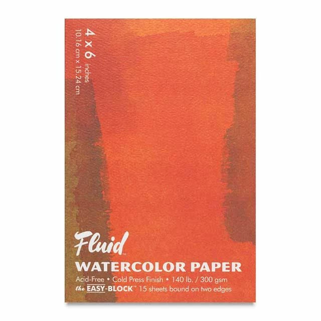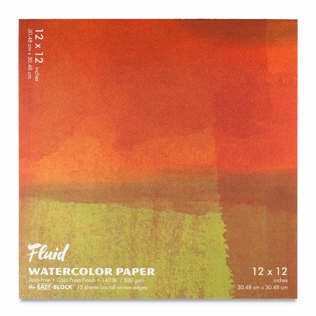 Each Fluid Watercolor Paper Easy-Block contains 15 sheets of 140 lb. cold pressed paper with a soft white color. The paper is internally and externally sized. Made from high quality alpha-cellulose, it carries the Certified Permanent Paper seal which ensures it’s acid-free and archival. Available in a range of sizes, including squares!