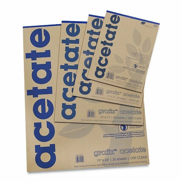 Grafix Acetate Film is the industry standard in graphic arts for layouts, color separations, overlays, stencils, screenprint positives, and many other general purpose applications. It is exceptionally clear, dimensionally stable, easy to cut, and will lay flat. This wood-pulp, cellulose di-acetate film is 100% biodegradable, and is even FDA approved safe for food contact.