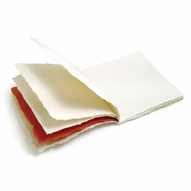 Each Khadi Handmade Paperback Book contains 30 sheets (60 pages) of handmade paper with deeply deckled edges that have been handbound into beautiful sketchbooks. The acid-free white paper is handmade in India with recycled 100% cotton rag and is internally sized with neutral pH size. This distinctive rough surface is suitable for watercolor and all other painting and drawing media.