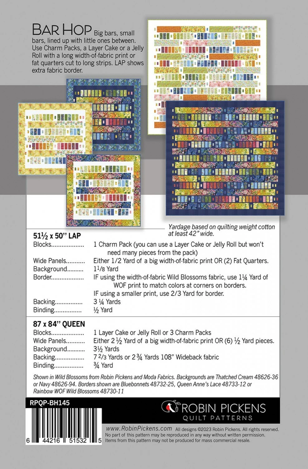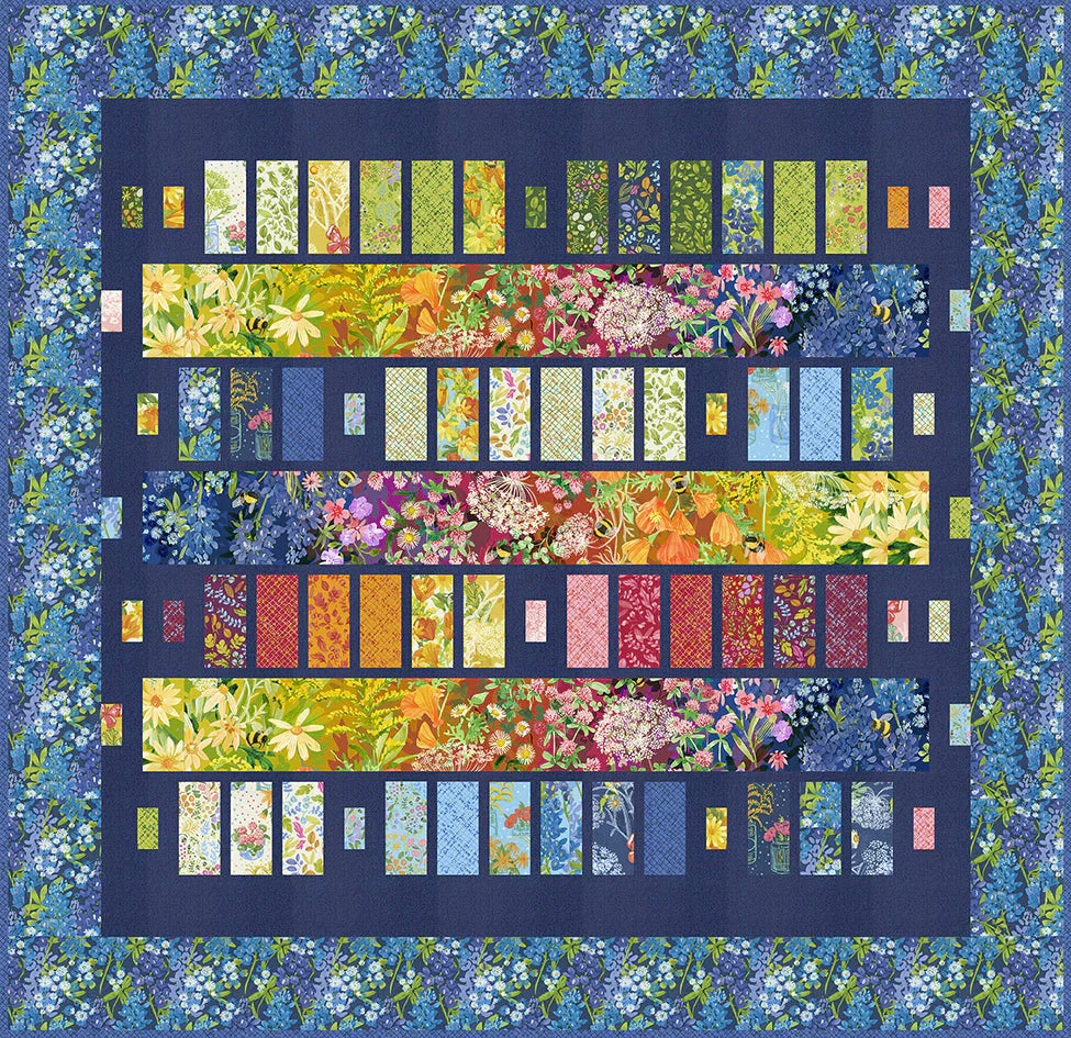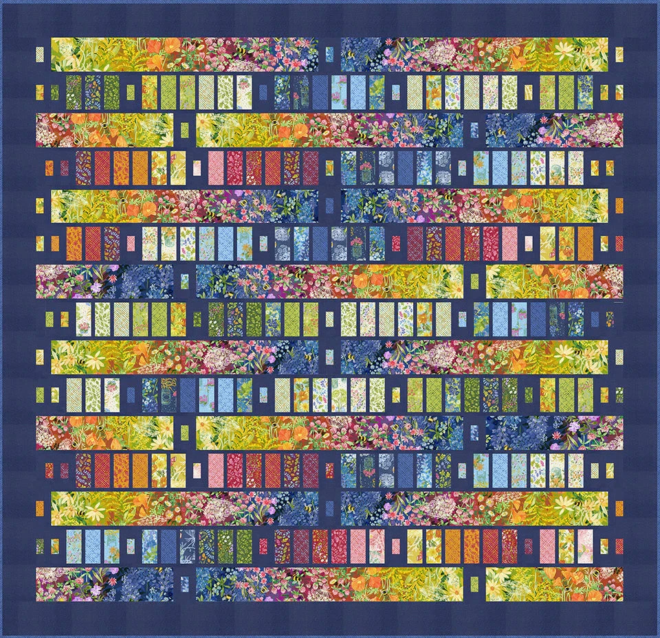 Big bars, small bars, lined up with little ones between! Use Charm Packs, a Layer Cake or a Jelly Roll with a long width-of-fabric print or fat quarters cut to long strips.