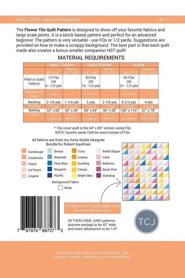 The Flower Tile Quilt Pattern is designed to show off your favorite fabrics & large scale prints. It is a block based pattern & perfect for an advanced beginner. The pattern is very versatile – use FQs or 1/2 yards. Suggestions are provided on how to make a scrappy background. The best part is that each quilt made also creates a bonus smaller companion HST quilt!