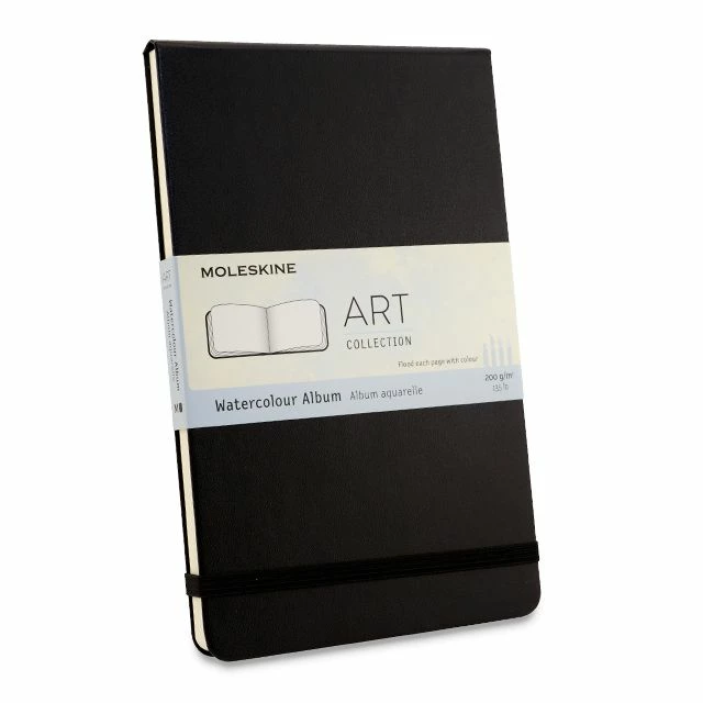 Moleskine Art Collection Watercolor Albums feature heavyweight 200 gsm. acid-free cold press paper composed of 25% cotton fibers. The off-white paper is thread bound into a black hardcover which includes an expandable pocket in the back, an elastic band to keep the book securely closed, and a ribbon bookmark.