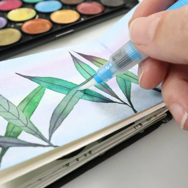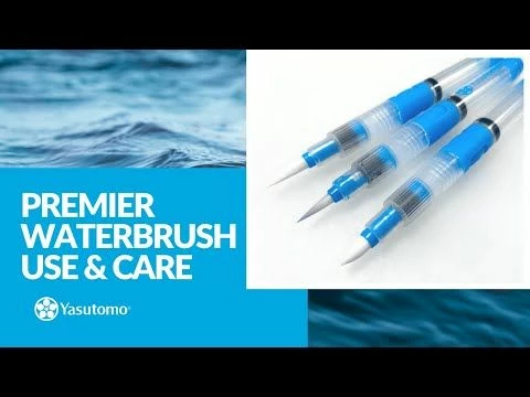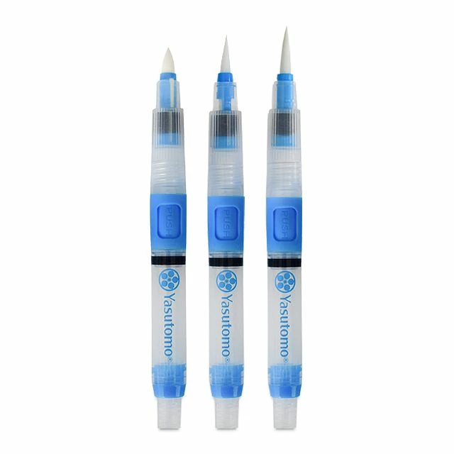 Niji Premier Waterbrushes feature a unique plunger system that is easier to fill than other waterbrushes. Unscrew and remove the brush tip, submerge the tip into water, and pull the plunger up to draw water into the barrel. Replace the brush tip and squeeze the barrel marked ‘Push’ to control flow.