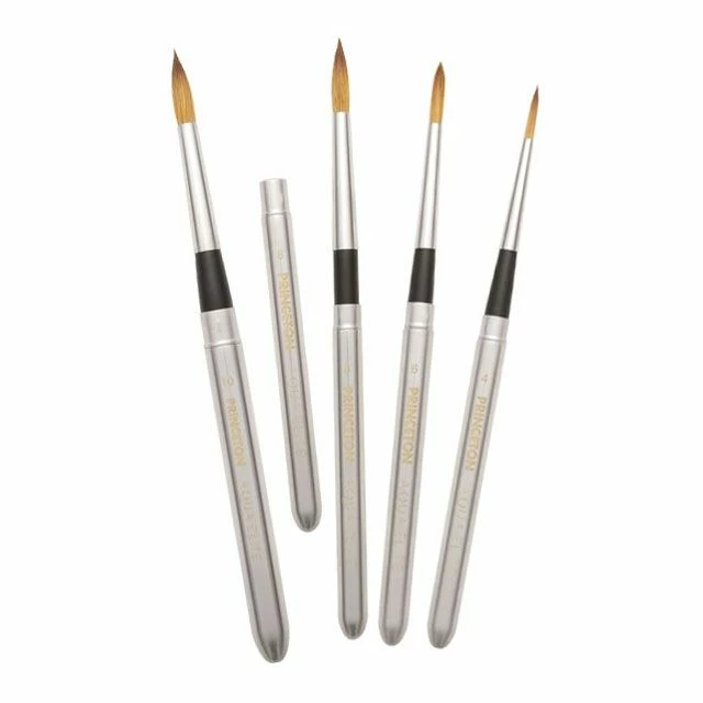 Princeton’s Aqua Elite Series 4850 watercolor brushes feature an innovative synthetic sable paint brush fiber that is indistinguishable from natural Kolinsky, yet significantly more affordable. Maximum color-holding ability, excellent shape retention for predictable performance, and fine points and edges for precision make the performance of this synthetic hair brush the new standard for discerning professional watercolor artists.