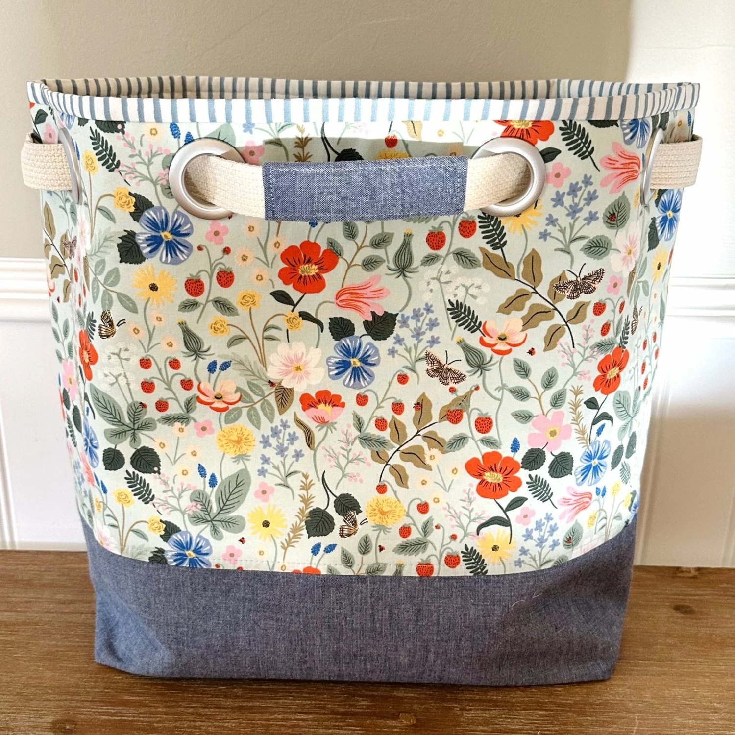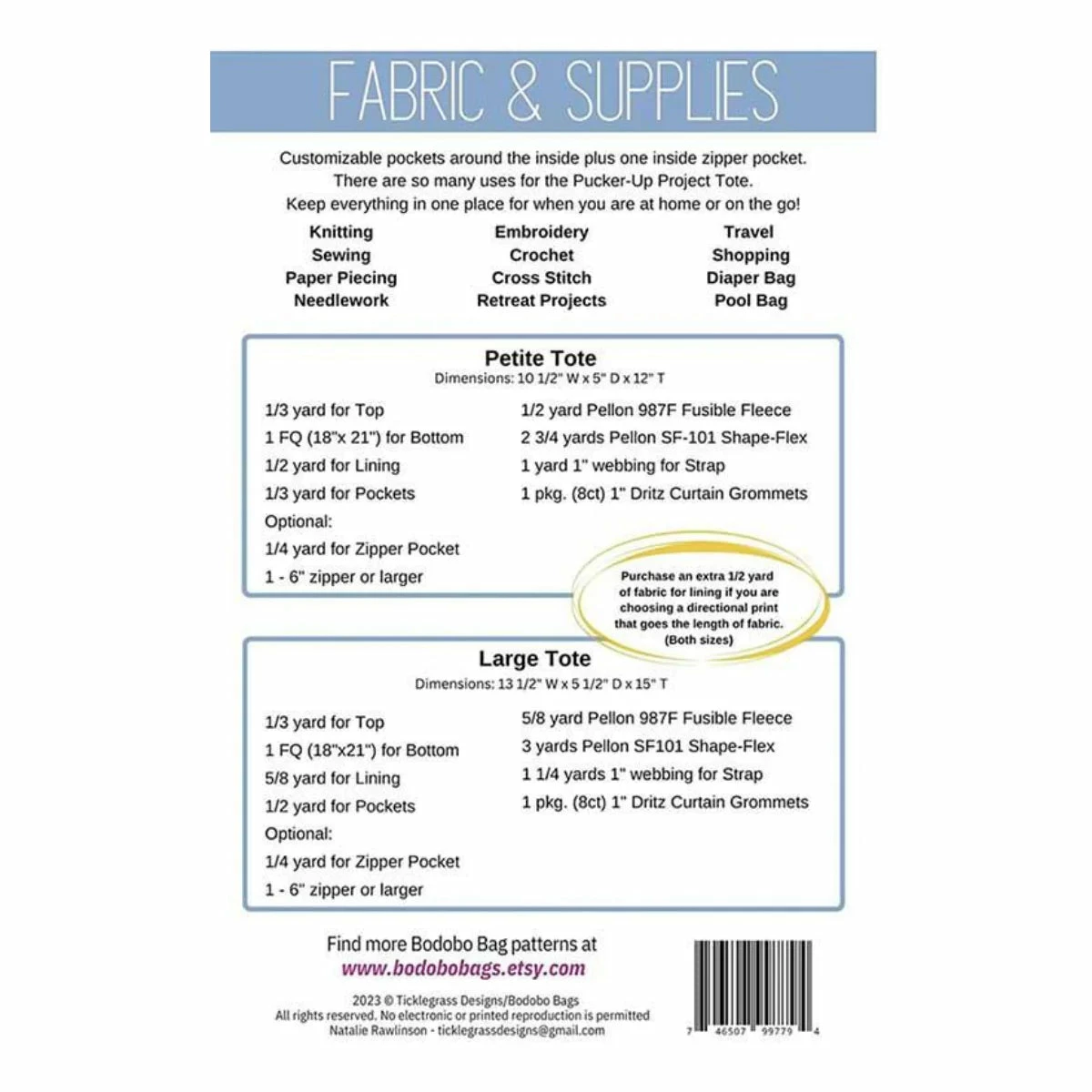 Finished Dimensions: Petite Tote: 10 1/2″ W x 5″ D x 12″ T / Large Tote: 13 1/2″ W x 5 1/2″ D x 15″ T