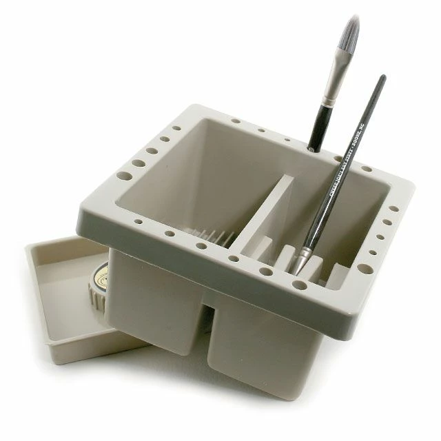 The Royal & Langnickel Brush Basin has three brush rests which suspends your brush bristles in solvent, so they do not bend. Grooves in the bottom aid in cleaning the brushes. It has room to store 22 brushes of different sizes, and has two interior compartments for wash water.