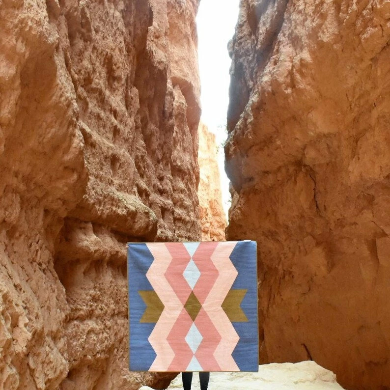 Southwest Diamonds is quick & fun quilt that features bold geometric blocks of color. This pattern uses equilateral triangles & is traditionally pieced. It includes instructions for using a square ruler with 30 & 60 degree lines or templates.
