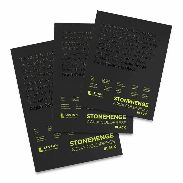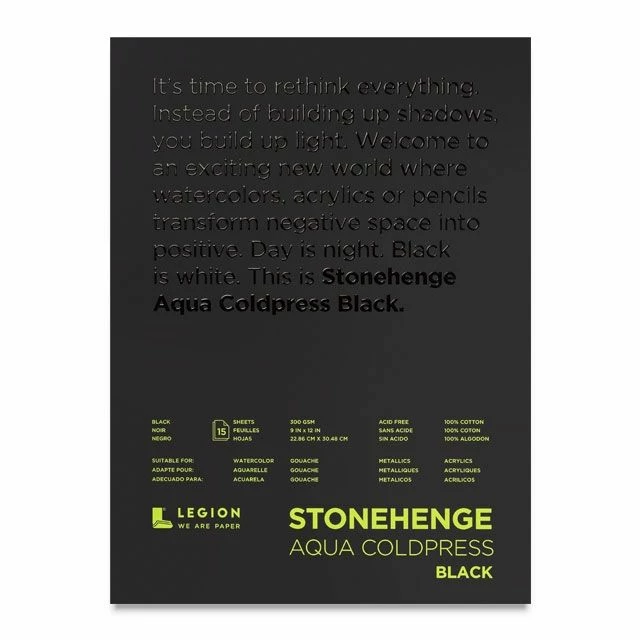 Aqua Black – Stonehenge Aqua Black Watercolor Paper is a 100% cotton black watercolor paper that opens up an exciting new world! Instead of building up shadows, one builds up light. It’s a place where negative space is transformed into positive. Ideal for metallic and pearlescent watercolor paints, pencils, pens, markers, and inks.