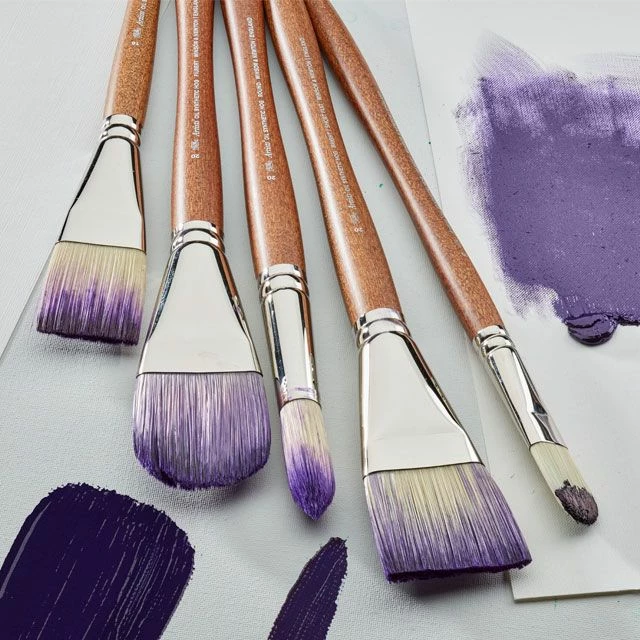 Available in a range of sizes across six shapes, this range was curated by oil and acrylic painters. The high-quality, firm bristles offer strong control when using full-bodied paint in a variety of strokes. The brush is very durable, resilient, and retains its shape even after heavy use. For use with oils, acrylics, alkyds, and watersoluble oils.
