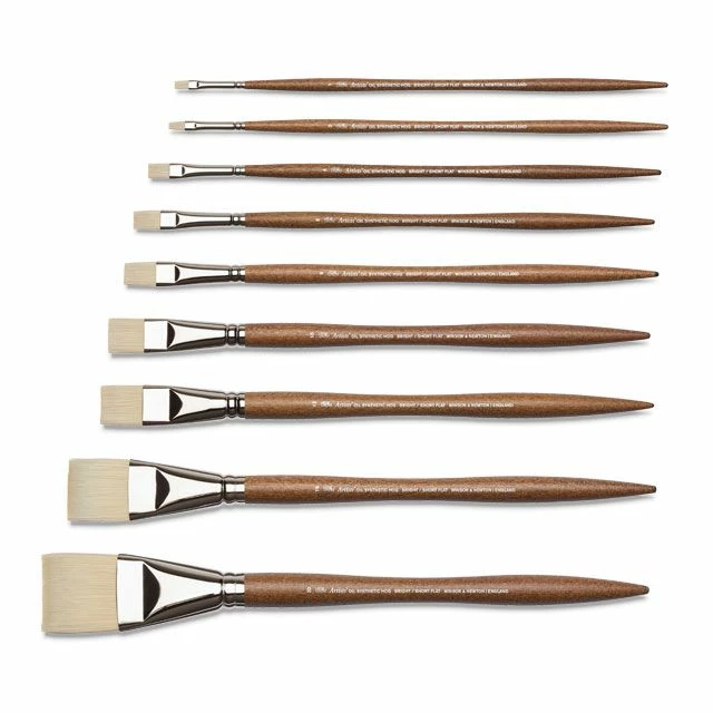 Bright – Use this short flat head for creating sharp edges with control and for moving stiff paint around.