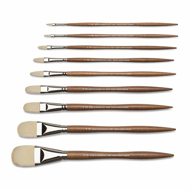 Winsor & Newton Artists’ Oil Synthetic Hog Brushes are oil and acrylic brushes that perform at a professional level. After rigorous artist testing, the best synthetic bristles were selected to replicate the flags of a natural hog hair bristle, allowing for excellent color carrying capacity. A flag is the natural, split tip of each bristle, which carries more color and is evident on the highest quality hog brushes.