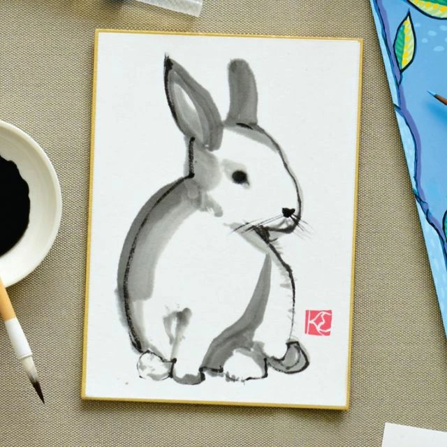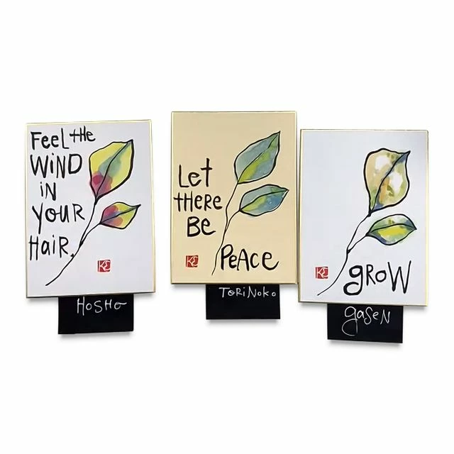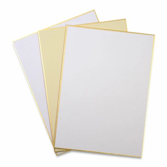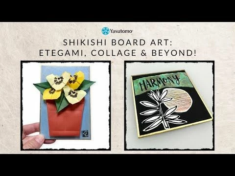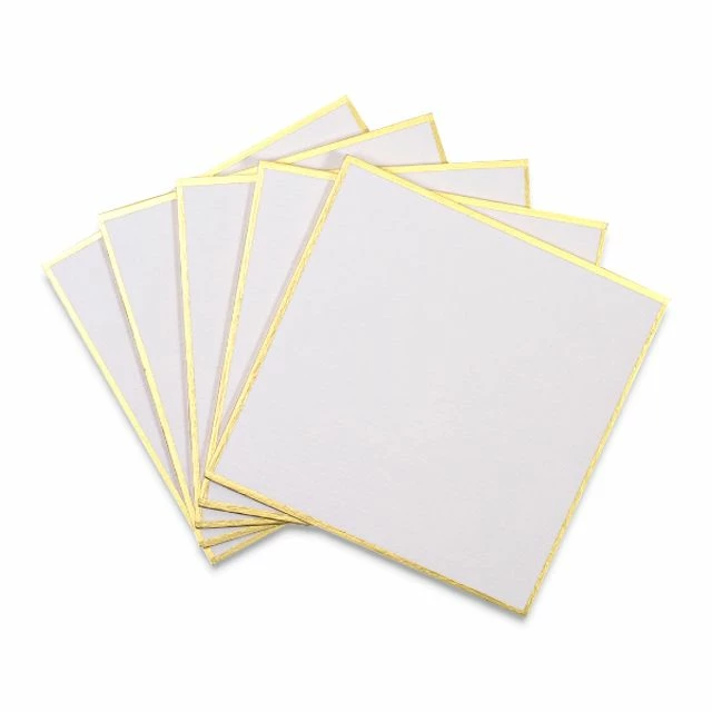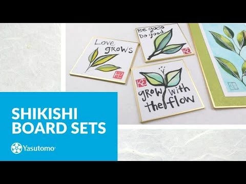 Yasutomo Shikishi boards are made from washi papers mounted to a hardboard backing and edged with gold foil. Shikishi boards are traditionally used for sumi-e, watercolor, and haiku painting and can also be used as a substrate for multimedia projects.